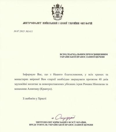 Предстоятель УПЦ Блаженніший Митрополит Онуфрій благословив в усіх храмах та монастирях Української Православної Церкви звершувати протягом 40 днів заупокійні молитви за новопреставлених убієнних ієрея Романа Ніколаєва та монахиню Алевтину (Кравчук). Про це повідомила Канцелярія Київської Митрополії.